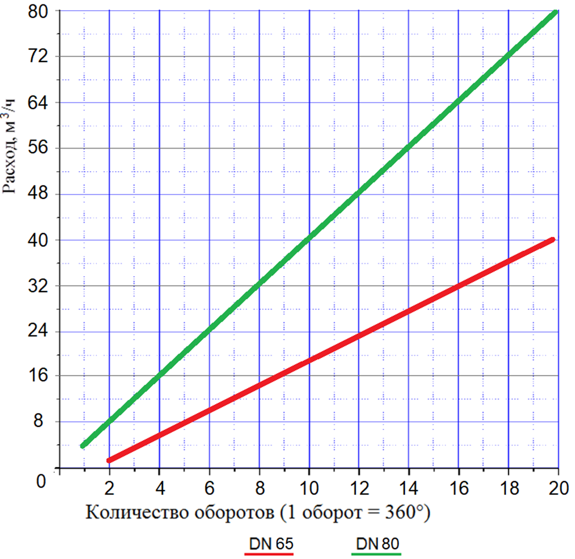 Настройка выполняется с использованием графиков или по показаниям теплосчетчика. Максимальный расход настраивается вращением гайкой настроечной 20 против часовой стрелки на необходимое количество оборотов в соответствии с диаграммой.